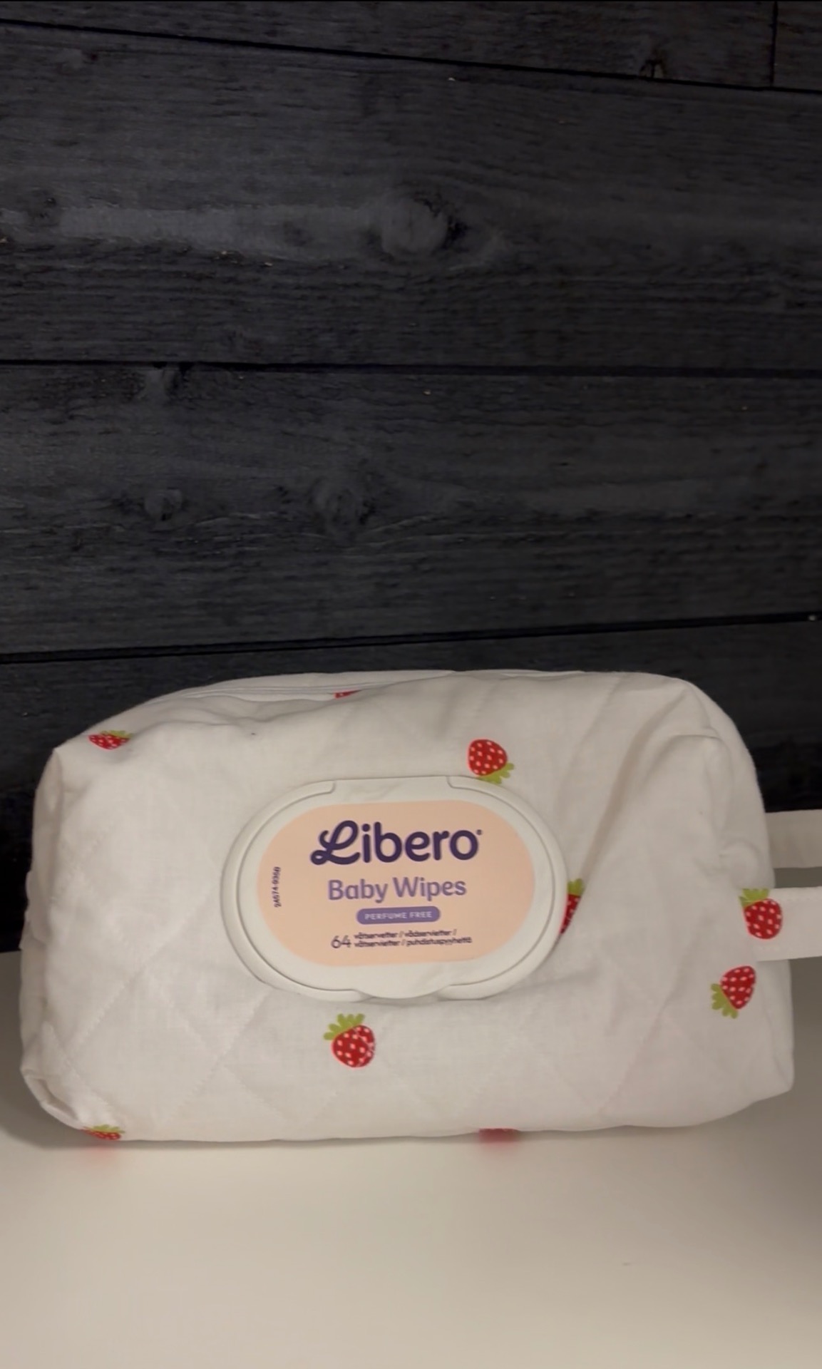 Necessär med jordgubbar på för baby wipes och annat som är bra att perfekt ha med på språng och ha med i skötväskan eller handväskan